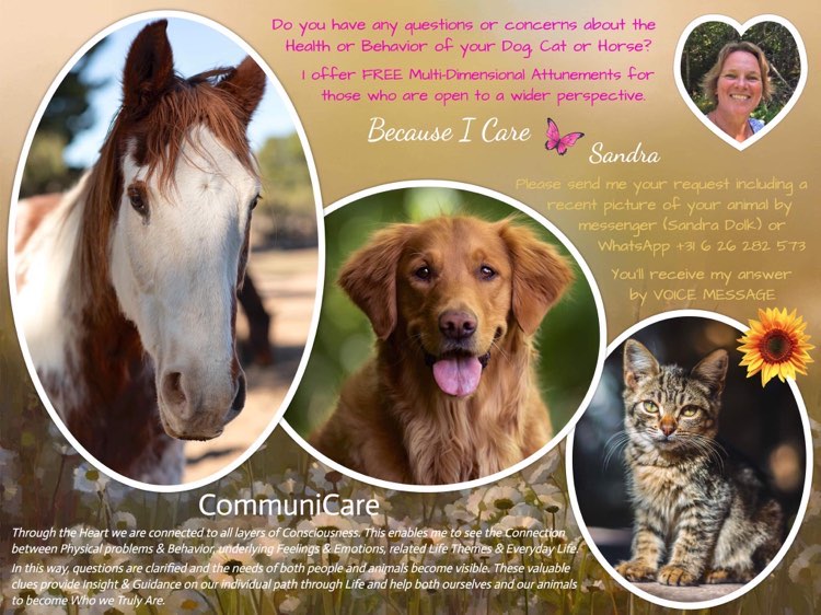 DEDICATION is the Essence of my own Nature. I was born with a Big Heart, which I have learned to trust thanks to my Life Course and the arrival of Zoey πΎ (reed below about Zoey & Me) As a result, the connection with myself has been restored and I have regained my original Freedom of Movement. Because of this I can empathize with the Animals and their Human Friends who are struggling with (the consequences of) stress and trauma and that I am committed to supporting them with Heart & Soul. Because I Care!